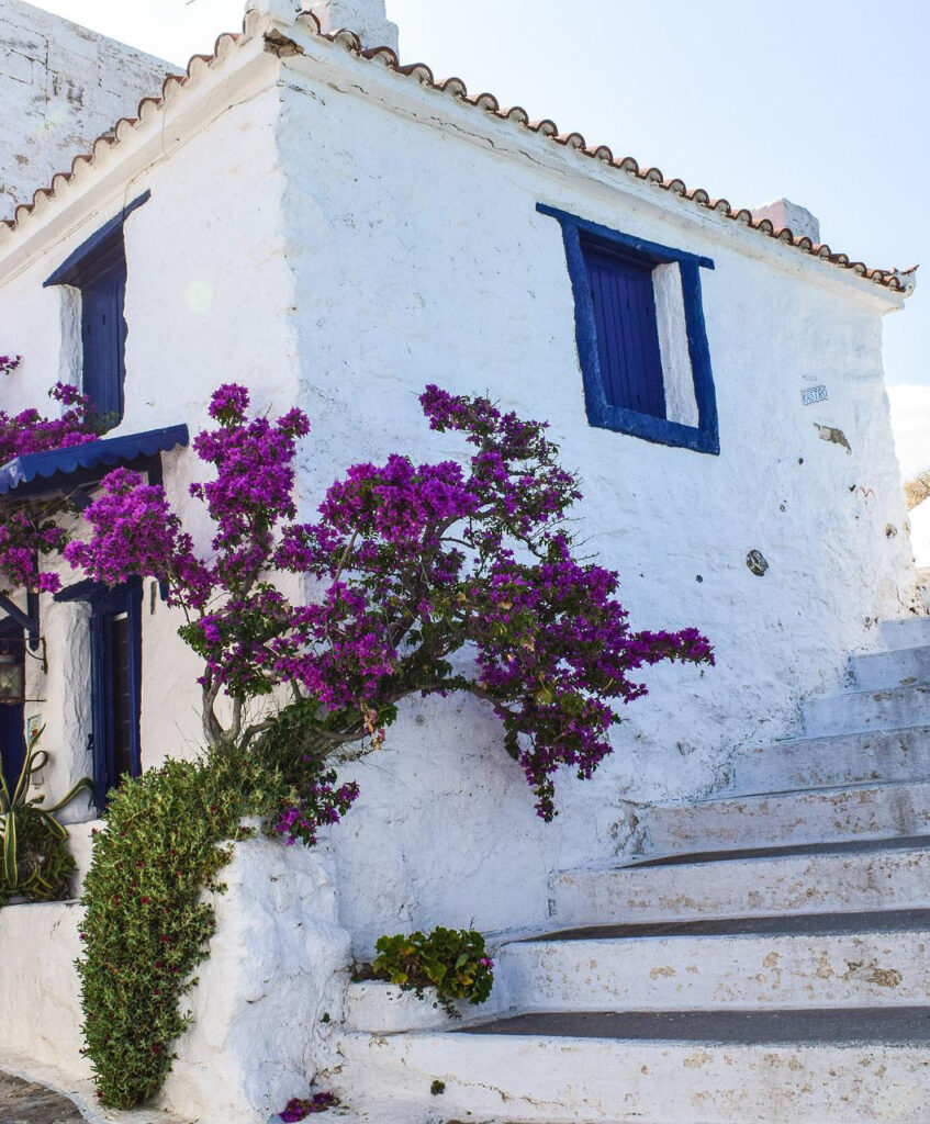 暑くなる昼日中は人影も少なく、静かに時間が過ぎていきます。小さな路地裏や階段がたくさんあり、散策にはもってこいです。鮮やかな色の草花があちこちに植えられ、白と青のコントラストの中に彩りを添えています。